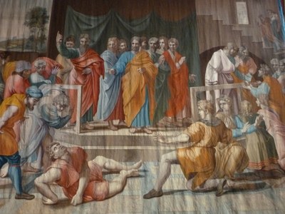 Pour décorer la Chapelle Sixtine le pape Léon X commande en 1515 à Raphaël 10 modèles de tapisserie sur la vie des saints Pierre et Paul d’après les Actes des Apôtres.
