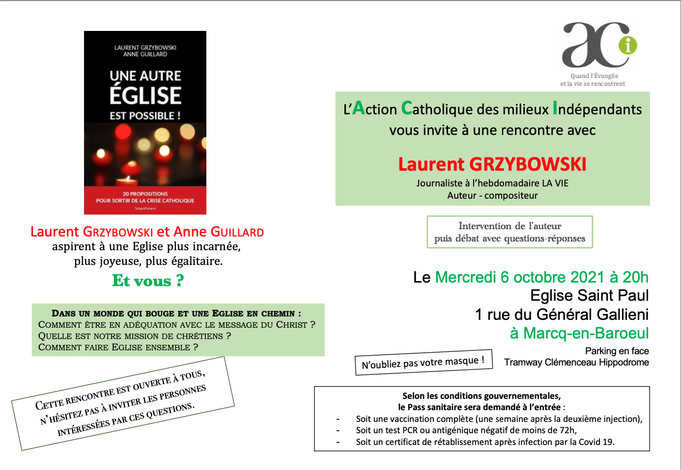 Suite à une rencontre en 2019 sur le thème "Réparons l'Eglise", l'ACI de Lille a trouvé pertinent de poursuivre la réflexion avec Laurent Grzybowski et son livre "Une autre Eglise est possible, 20 propositions pour sortir de la crise". Dans son livre, il nous détaille 20 propositins concrètes à mettre en oeuvre dans nos paroisses, dans nos mouvements. Ensemble, chrétiens, nous sommes appelés à parler le langage du monde, et à le rejoindre dans ses aspirations. Nous sommes corresponsables avec les curés, les EAP, les paroissees, pour ensemble, et chacun prendre une part dans la diffusion du message de l'Evangile, dans une Eglise qui peut nous sembler cléricale, ou loin des personnes.