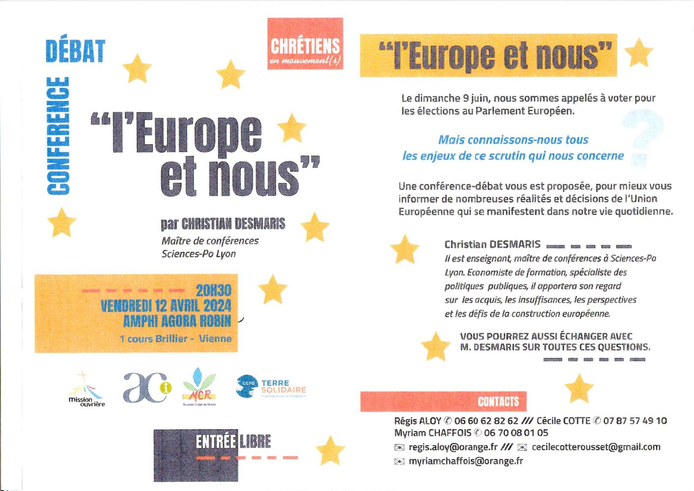 - Christian Desmaris, Maitre de conférences Sciences-Po Lyon. Economiste de formation, spécialiste des politiques publiques, il apportera son regard sur les acquis, les insuffisances, les perspectives et les défis de la construction européenne.
