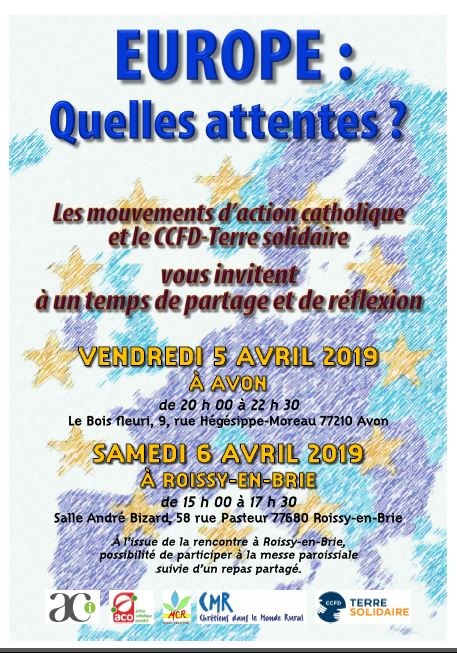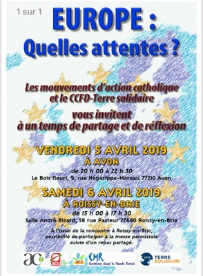 Pour la 3e année consécutive, les mouvements d'Action catholique (ACI, ACO CMR, MCR) du diocèse de Meaux associés au CCFD-Terre solidaire, organisent un temps de réflexion et d'échange entre les participants. À l'approche des élections européennes, le choix a été fait de discuter sur "l'Europe? Quelles attentes?", avec un partie attirant l'attention sur la dimension chrétienne de la construction européenne.