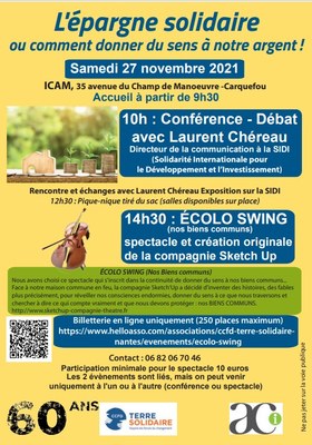 Le territoire de Nantes, en association avec le CCFD Terre solidaire, organise une conférence sur la finance solidaire le matin et l'après-midi un spectacle théâtral à partir de l'encyclique "Laudato si" avec une troupe professionnelle de Marseille, intitulée "Sketch up"